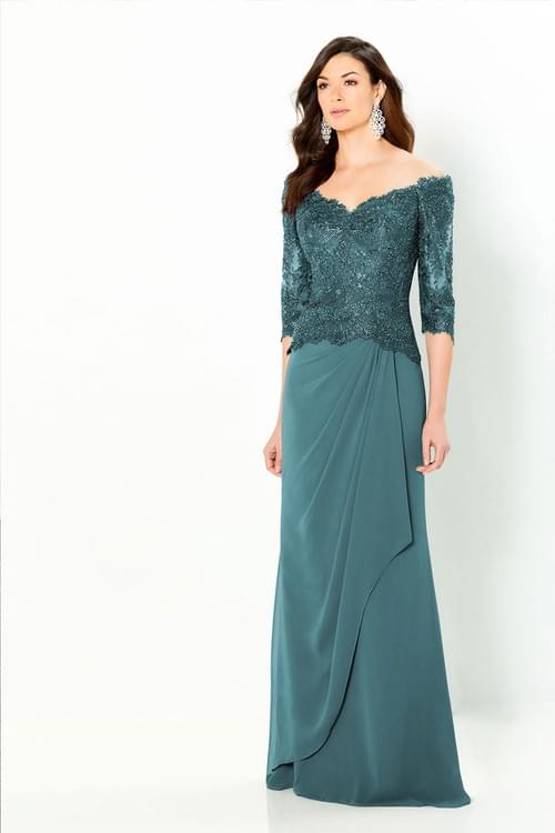 Vestido de mangas ¾ con hombros descubiertos de gasa y encaje, con escote en V suave, cintura caída con detalle de cascada, espalda en V, cola amplia y detalles de cristal.