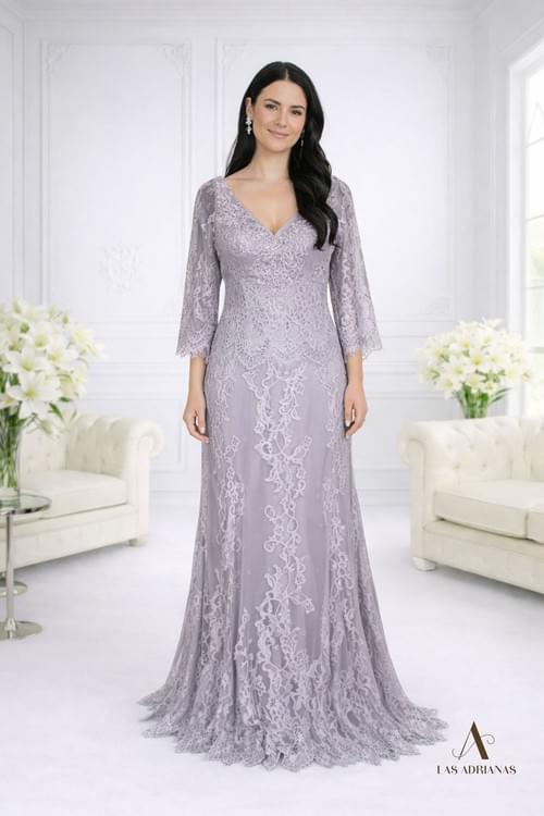 Elegante Vestido de Madrina en encaje. Escote en V delantero y espalda. Faldón de poca amplitud.